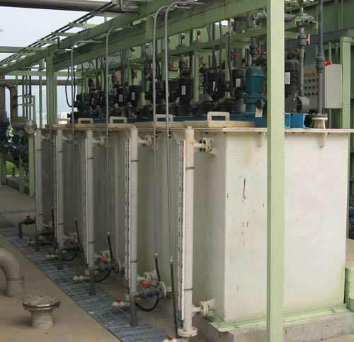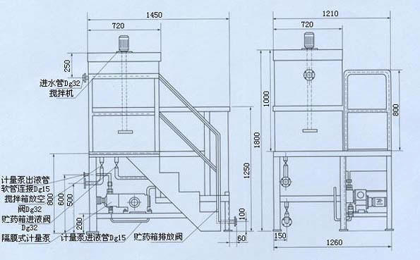 6.1 構(gòu)成 JA型加藥設(shè)備配有一個(gè)玻璃鋼材質(zhì)的藥劑溶解槽,并配有一套電動(dòng)攪拌機(jī),兩個(gè)藥劑溶液槽,一套投藥裝置及配管、鋼制平臺(tái)梯子等部件組成一個(gè)整體。
