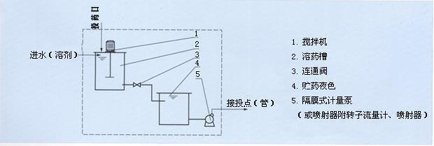 一、加藥裝置 在水處理、化工、印染等行業(yè),需向水中或其它液體中按比例的投加另一種液體,其生產(chǎn)過(guò)程是連續(xù)的,這種投加工作也必須同樣是連續(xù)的,如水處理中投加混凝劑、助凝劑、消毒劑、冷卻塔投加阻垢劑、化工、印染中定時(shí)定量投加一定量的化學(xué)藥劑、酸堿等,這些都需要一種既能配制溶液,又能定量定時(shí)投加藥劑的設(shè)備,而這正是我們的TV系列加藥裝置所需具備的基本性能。