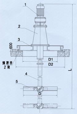 3.1 型號(hào)示例 設(shè)備可根據(jù)水量及攪拌池尺寸設(shè)計(jì)雙層槳或多層槳,并可根據(jù)攪拌介質(zhì)采用相應(yīng)防腐或采用不銹鋼材質(zhì)。