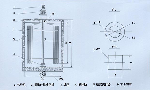 4.1 型號(hào)示例 LFJ型反應(yīng)攪拌機(jī),主要用于給水排水工程混合工序之后經(jīng)過(guò)加藥混合的原水通過(guò)作緩慢反應(yīng)攪拌,使混凝水中的懸浮物和膠體形成大顆粒絮凝體以利于沉淀池的重力分離。