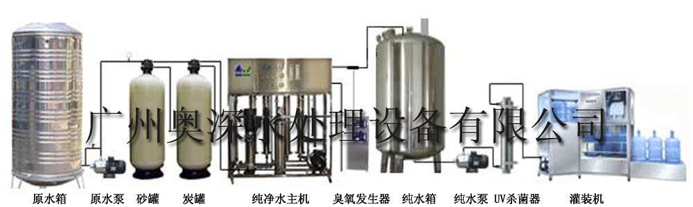 原水箱→原水泵→機械過濾器→活性炭過濾器→軟水器→保安過濾器→超濾裝置→產(chǎn)品水箱→輸送泵→紫外線殺菌器→灌裝線